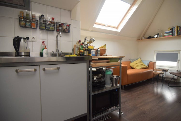 You enter the living room with open kitchen. The kitchen is equipped with an electric hob, fridge (freezer) cupboard and extractor. Opposite the kitchen you have access to the bathroom.