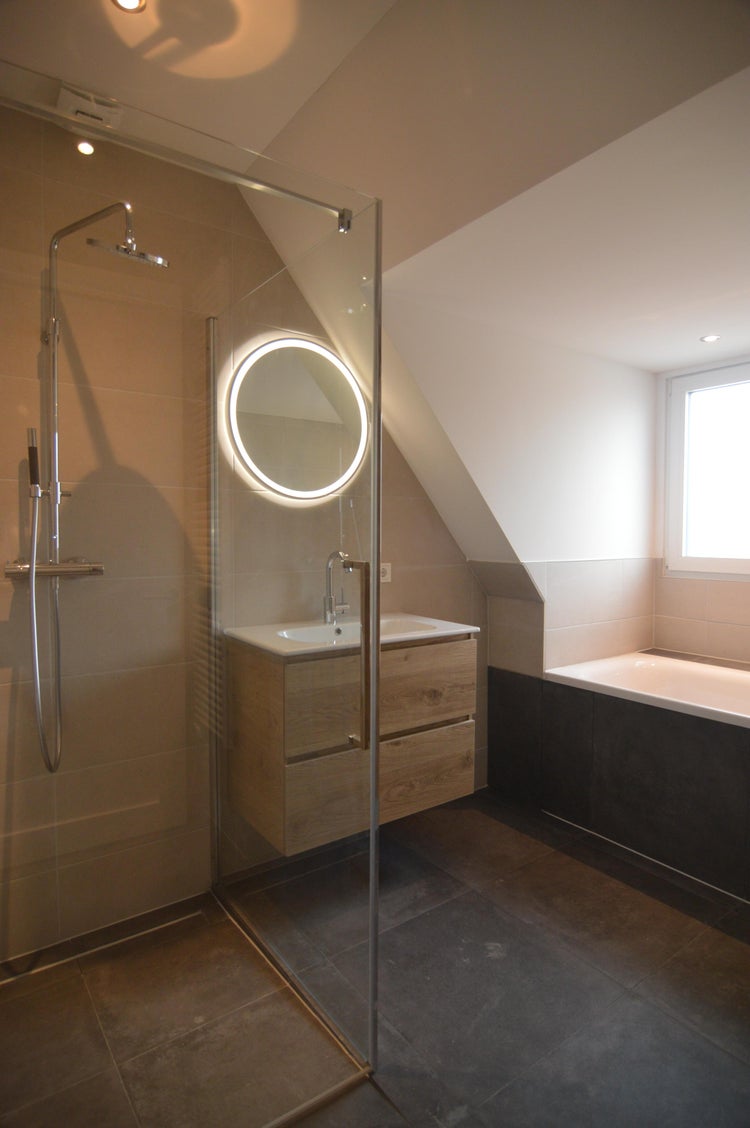 Op de eerste verdieping zijn zowel aan de achterzijde als aan de voorzijde twee ruime slaapkamers aanwezig met een dakkapel op stahoogte. De kamer aan de achterzijde geeft toegang via een deur naar het balkon. De royale badkamer is voorzien van een ligbad, separate douchecabine met een stortdouche en een handdoekenradiator. Ook is hier voldoende bergruimte aanwezig zowel in wastafelmeubel als in een bijbehorende lange kast. Tevens is op deze verdieping ook een separaat toilet aanwezig.